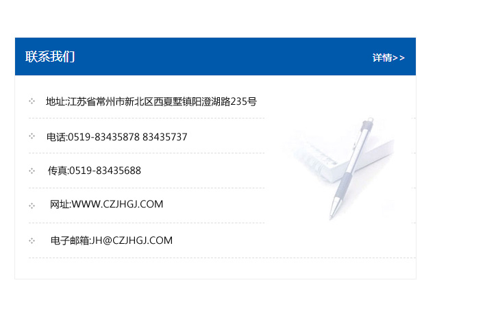 傳真:0519-83435688    郵編:213135    網址:WWW.czjhgj_com.cnhuijie.com    電子郵箱:JH@czjhgj_com.cnhuijie.com